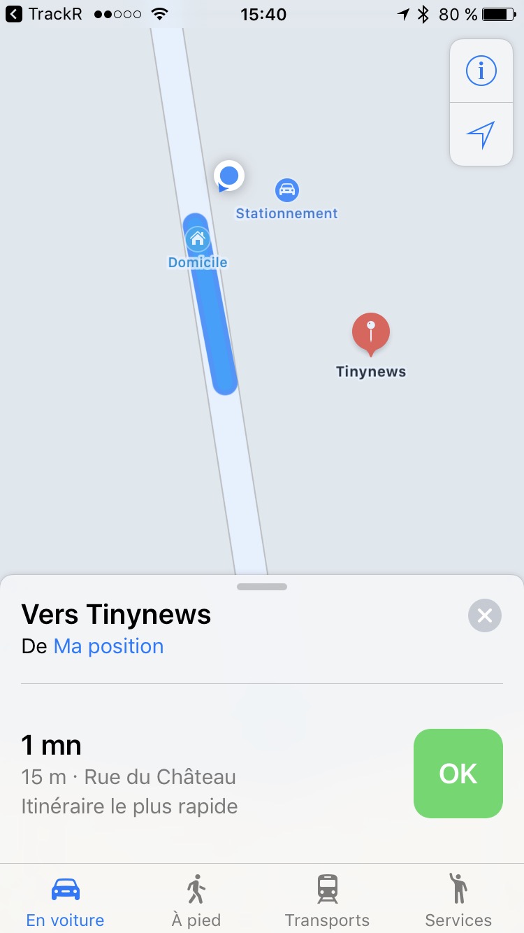 Pour ce qui est du “Trouve ma voiture“, c’est assez efficace. Comme expliqué précédemment, votre smartphone va enregistrer la dernière position connue de votre TrackR après perte du signal Bluetooth. Il vous suffira donc d’afficher ce point sur une carte et de vous laisser guider en avançant vers votre véhicule. C’est tout simple et vraiment pratique. Rien à redire.