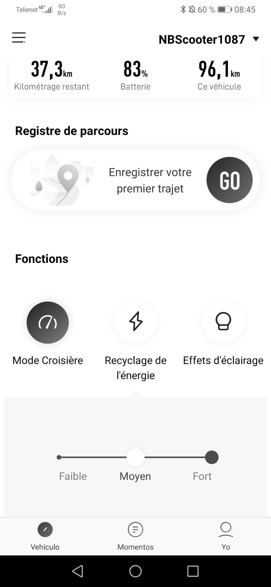 La ES2 s’utilise avec l’application Segway-Ninebot (pour Android et iOS) qui permet de régler certains paramètres (l’intensité du frein moteur, l’activation du cruise control,etc.), mais aussi de vérifier la distance parcourue par jour, par semaine et depuis son achat. La connexion à une application mobile est pour moi un gros avantage. Ninebot propose même des mises à jour pour ses trottinettes offrant des améliorations comme la gestion de la batterie, la gestion de la seconde batterie pour la ES4 et bien d’autres encore.
