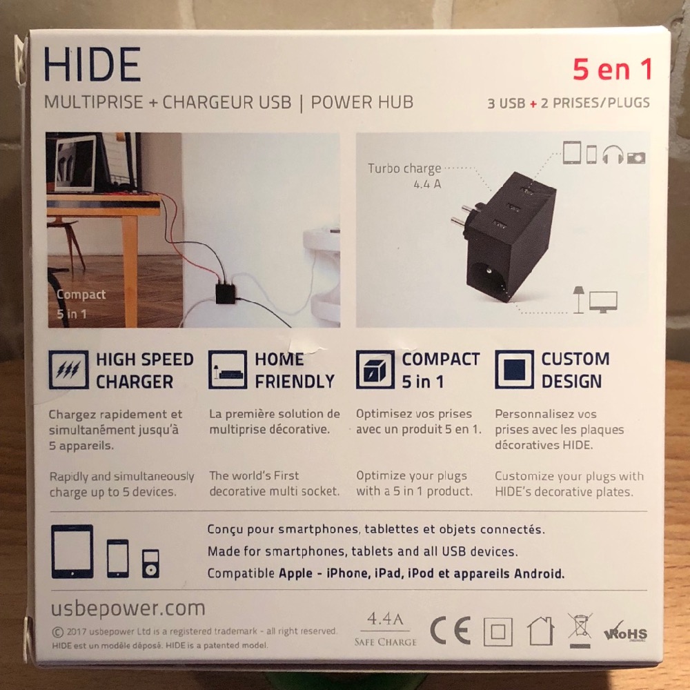 Fiable, design, pratique et très discret, ce chargeur Usbepower Hide offre une réelle valeur ajoutée à votre bureau ou pièce de vie, tout en transformant une prise en … multiprise du plus bel effet. Un joyau, vraiment, tout en sachant qu’il s’agit du fruit d’une société parisienne qui a le vent en poupe !