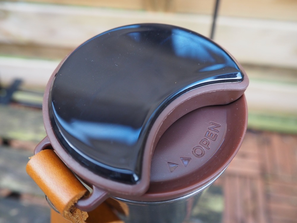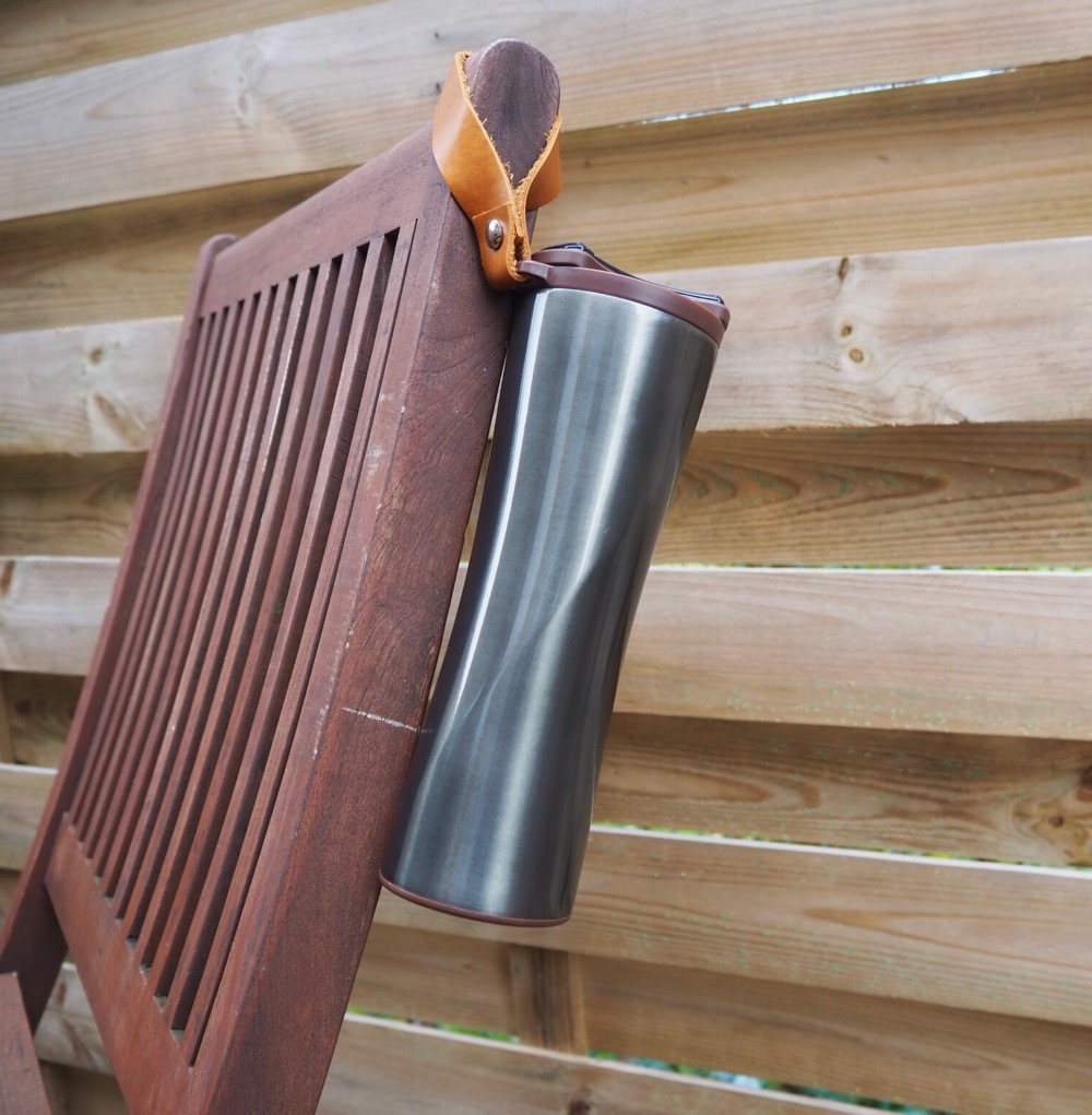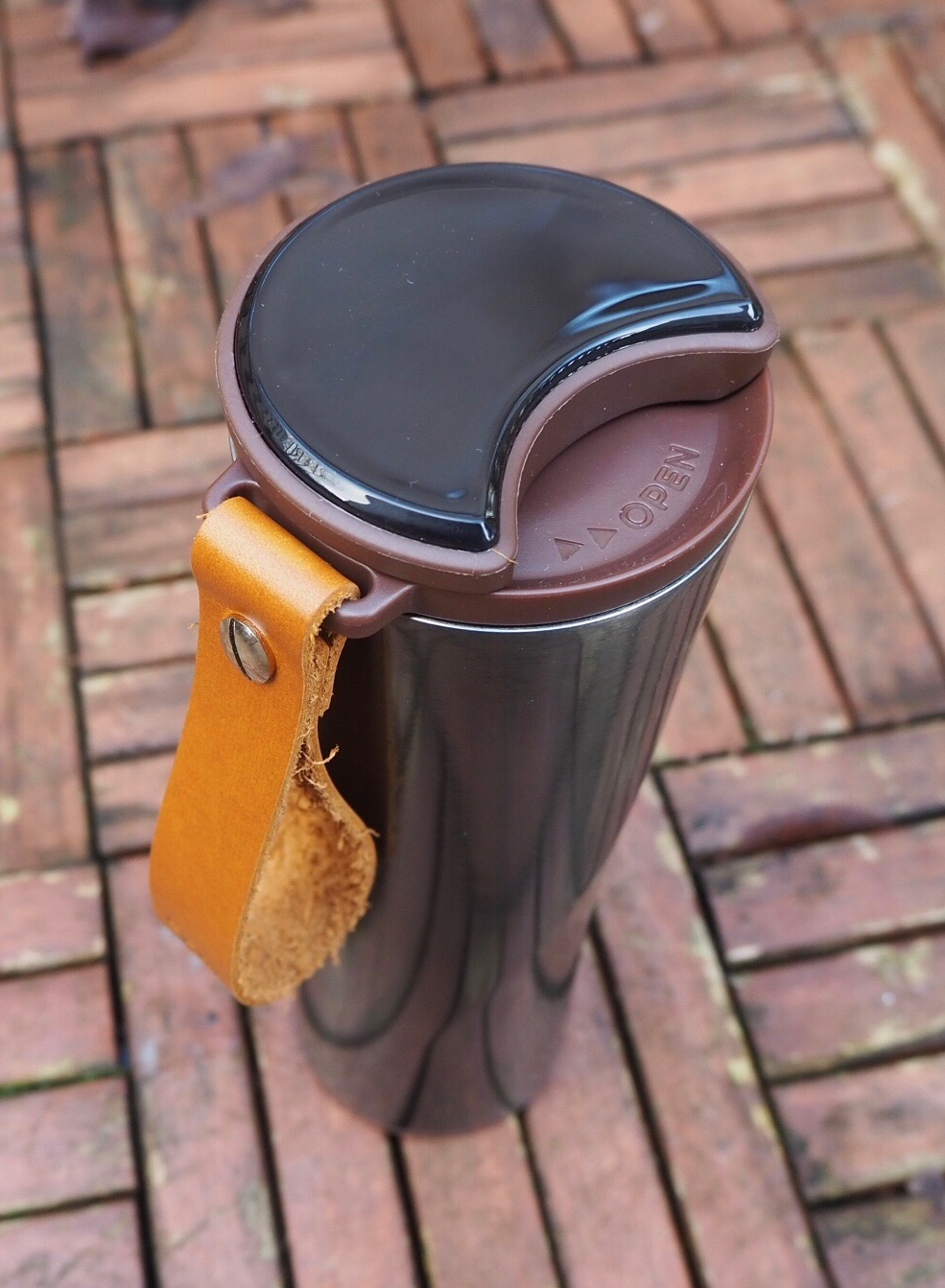 La lanière en cuir, quant à elle, s’avérera très pratique pour le transport. Je peux porter le mug au bout d’un doigt ce qui me laisse la main totalement libre pour transporter autre chose et m’éviter de faire un trajet supplémentaire vers la voiture. Personnellement, quand je quitte la maison au matin, je suis toujours hyper chargé avec mon sac PC, les cartables et mon lunch bag. Bref, un très bon point !
