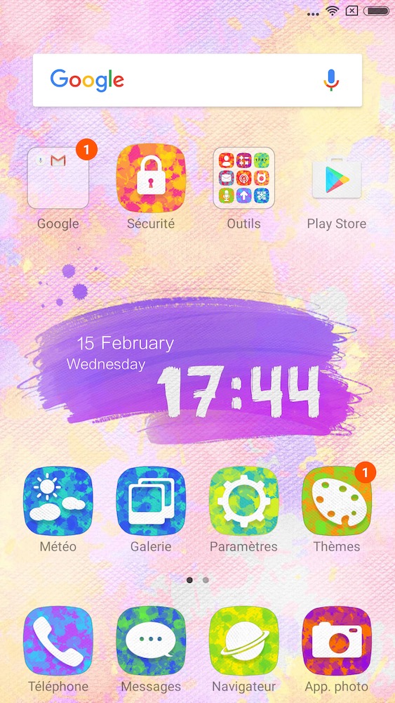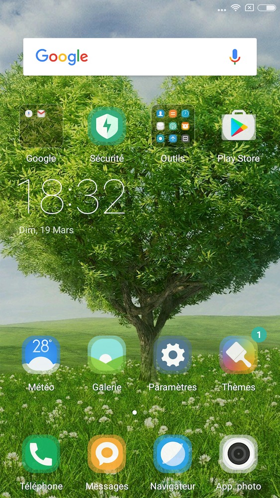 J’arrive enfin sur l’écran d’accueil, simple, classe. Une icône attire immédiatement mon œil : « Thèmes ». Petite promenade sur les écrans associés qui me proposent de télécharger des thèmes gratuits pour changer mon environnement. J’essaie un truc un peu rétro avec un style dessin au crayon et là, la claque ! Non seulement c’est à mon goût mais surtout toutes les icônes « de base » ont été modifiées pour s’accorder au style choisi. J’adore ! Hop, j’essaie un autre, puis un autre, en extase devant les résultats. Comme on est proche de la St Valentin, je finis par choisir un truc printanier avec un arbre en cœur. Sourire aux lèvres, j’ai déjà oublié les désagréments de l’installation initiale.