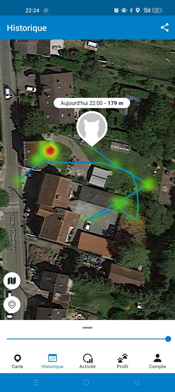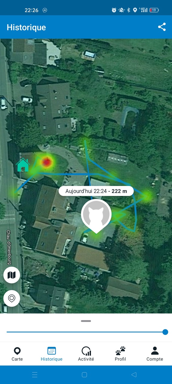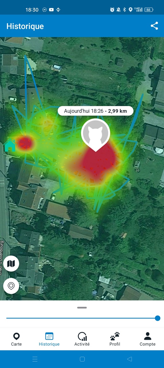 - L’historique de déplacement, qui permet de connaître les endroits que l’animal a l’habitude de fréquenter. Information pertinente si la batterie est plate, afin de diriger les recherches dans les zones habituelles.