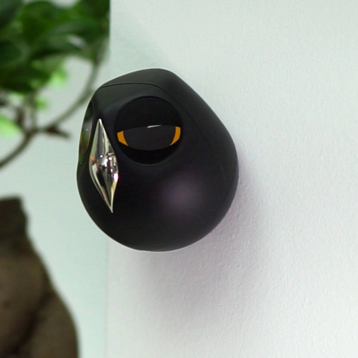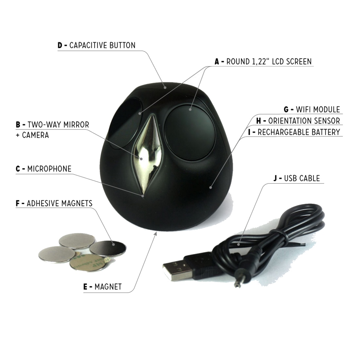 Alors, pour commencer, il s’agit d’un object imaginé par un designer industriel français : Vivien Muller. Ensuite, concernant ce ULO, il s’agit donc d’une caméra connectée via Wifi 802.11ac et qui embarque une caméra full HD disposant de deux petits écrans LCD à la place des yeux. Ceux-ci vont donc être utilisés pour communiquer au travers de sympathiques mimiques. Ces expressions pourront être modifiées avec l’application à installer sur votre smartphone : Couleur des yeux, tailles des pupilles, etc.