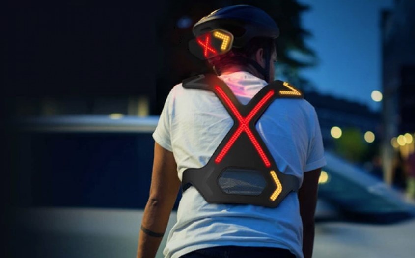 WAYV se compose d’un harnais et d’un casque. Chacun d’eux intègre un éclairage blanc permanent à l’arrière (et à l’avant pour le harnais). Le système propose aussi une télécommande équipée d’un petit levier façon clignoteur de voiture qui vous permettra d’actionner une flèche rouge représentant la direction que vous allez prendre. A noter qu’un flèche blanche sera aussi présente à l’avant.