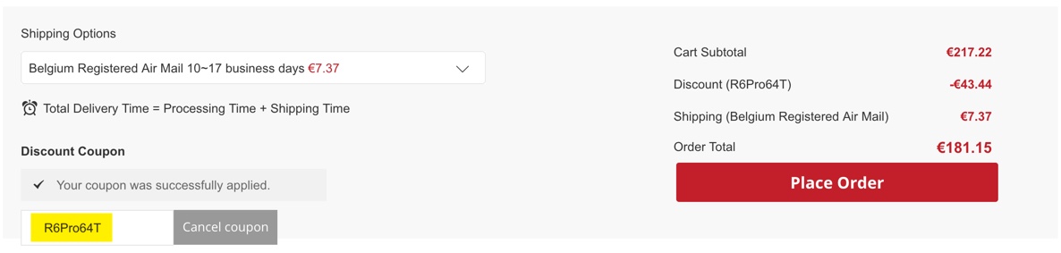Grâce au code R6Pro64T, il ne vous en coutera que 175€ au lieu de 217€ et c’est sur GearVita que ça se passe ! N’oubliez pas de sélectionner « Registered AirMail » !